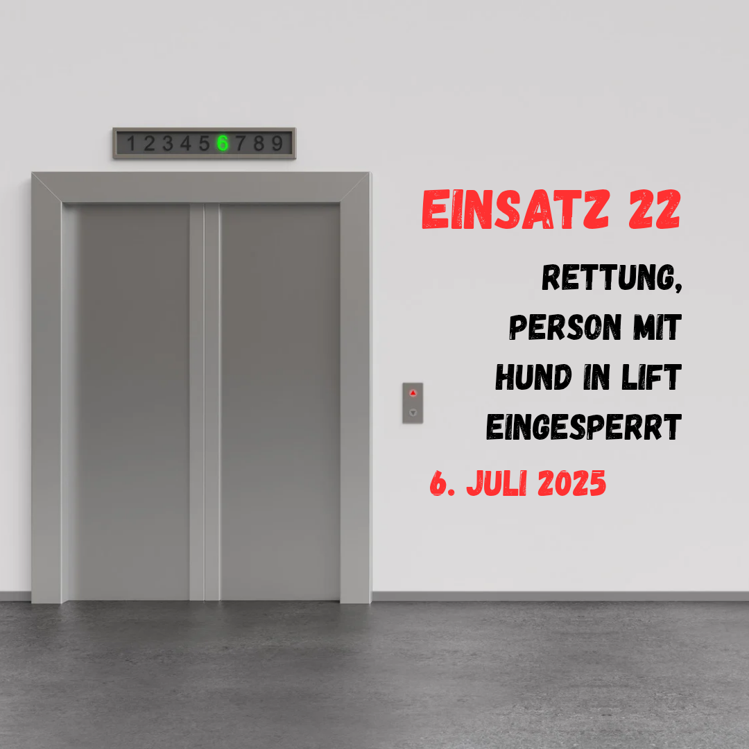 Eine Person ist mit ihrem Hund in einem Lift stecken geblieben. Die Person konnte mittels einer Teleskopleiter über das Dach des Liftes befreit werden. Der Hund wurde durch einen AdF ebenfalls gerettet.